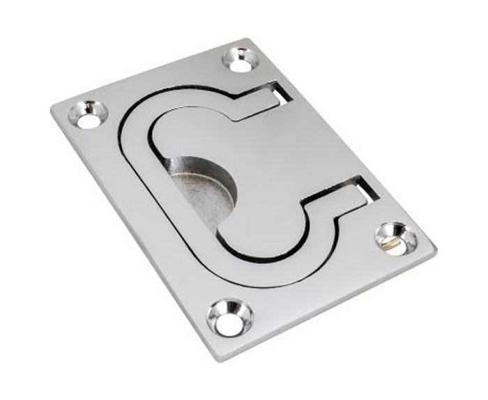 Sea-Dog Chrome Brass Lift Handle 54mm x 76mm. This Hatch Pull features a handle that pivots out to open hatches and lays flush when not in use for a clean appearance. Ideal for use on doors, hatches, lazarettes, and dock boxes. Constructed of sand cast brass with a chrome plated finish. Installs with four #8 FH fasteners (not included).