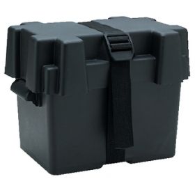 SEACHOICE 22080 SEACHOICE LARGE BATTERY BOX. Black molded high density polyethylene. Complete with hold down foot strap and mounting hardware. Fits 24 series: 266 x 184 x 254mm. Fits 27 Series : 355 x 184 x 25mm. Large Battery Box.
