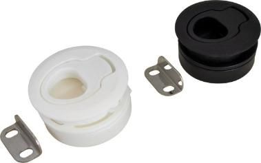 Sea-Dog Nylon Slam Latch Black. These Slam Latches feature push-to-close functionality. Activated by the shutting or slamming of a door, they are designed so that a spring inside automatically retracts the latch, engaging the keeper and retaining the cover against the frame. Fast and easy to use, this latch features a recessed, rattle-free, spring loaded handle for quick access. Constructed of UV resistant injection molded nylon. Easy to install by simply inserting the latch body through a single round 2" cutout and screwing on the back plate. Includes hardware to mount latch. Keeper plate installs with two #12 RH fasteners (not included). Available in black or white.