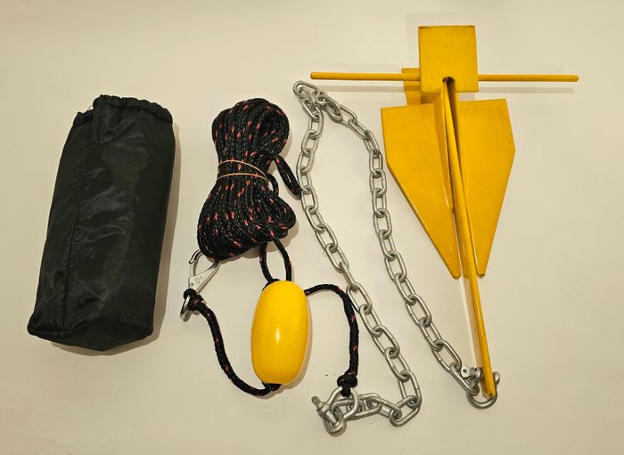 small danforth anchor, 2.4 kg, 120cm chain, 7.6m 7mm polyethylene rope, 20A PVC float in a nylon storage bag. Ideal jet ski or kayak anchor